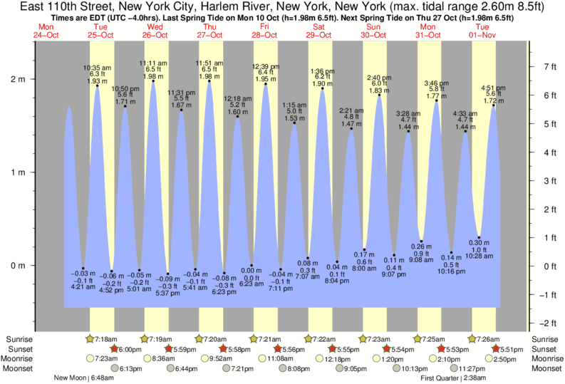 Tide Times are EST (UTC -5.0hrs). Last Spring High Tide at East 110th Street City, Harlem River, New York was on Fri 19 Dec (height: 1.68m 5.5ft). Next high Spring Tide at East 110th Street City, Harlem River, New York will be on Sat 03 Jan (height: 1.95m 6.4ft).