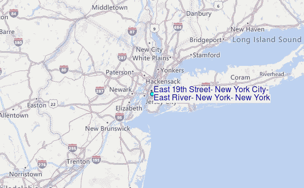 Use this relief map to navigate to tide stations, surf breaks and cities that are in the area of East 19th Street, New York City, East River, New York, New York.