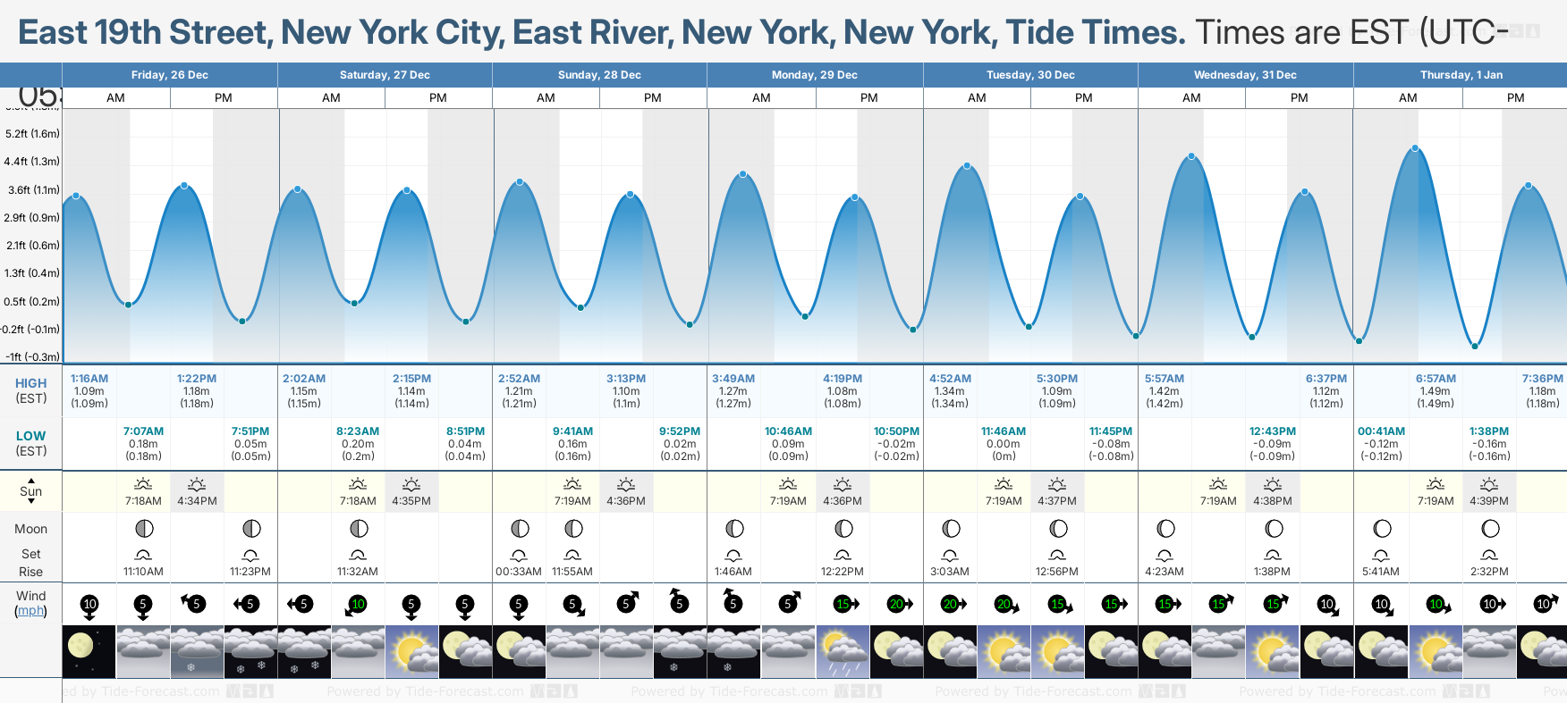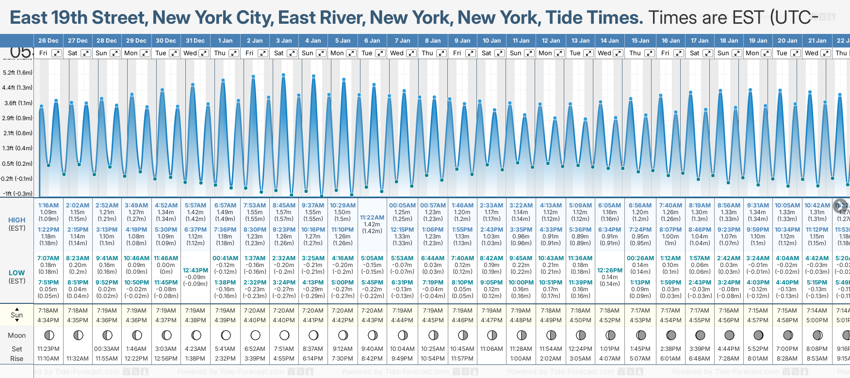 December and January Tide charts for East 19th Street City, East River, New York: The tide charts below show the height, time and date of high and low tides for the next 30 days.