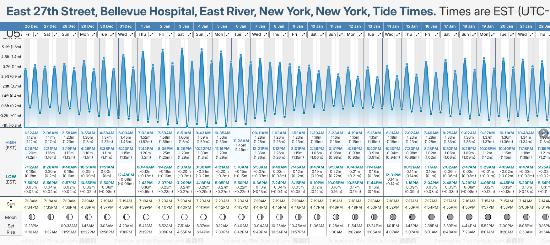 December and January Tide charts for East 27th Street, Bellevue Hospital, East River: The tide charts below show the height, time and date of high and low tides for the next 30 days.
