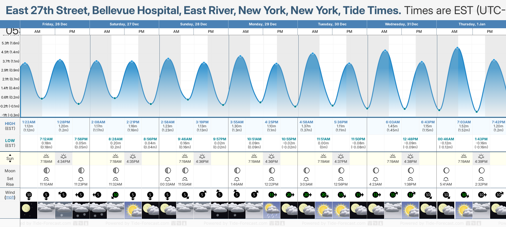 Today's tide times for East 27th Street, Bellevue Hospital, East River: Friday 26 December 2025