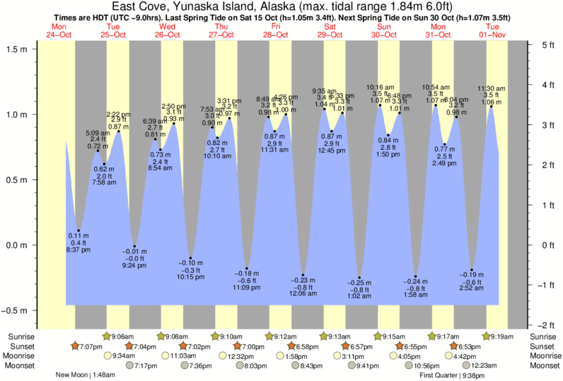 December and January Tide charts for East Cove, Yunaska Island: The tide charts below show the height, time and date of high and low tides for the next 30 days.