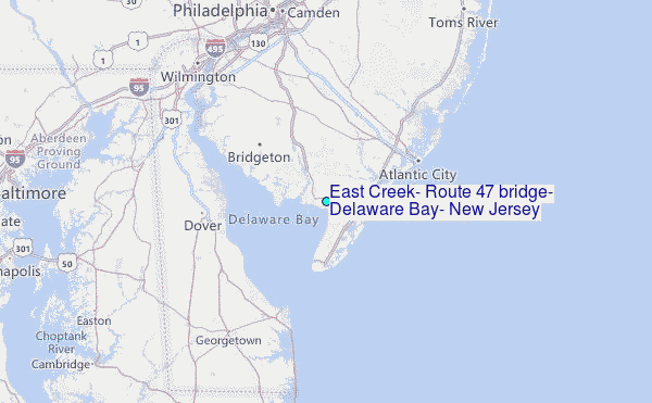 Use this relief map to navigate to tide stations, surf breaks and cities that are in the area of East Creek, Route 47 bridge, Delaware Bay, New Jersey.