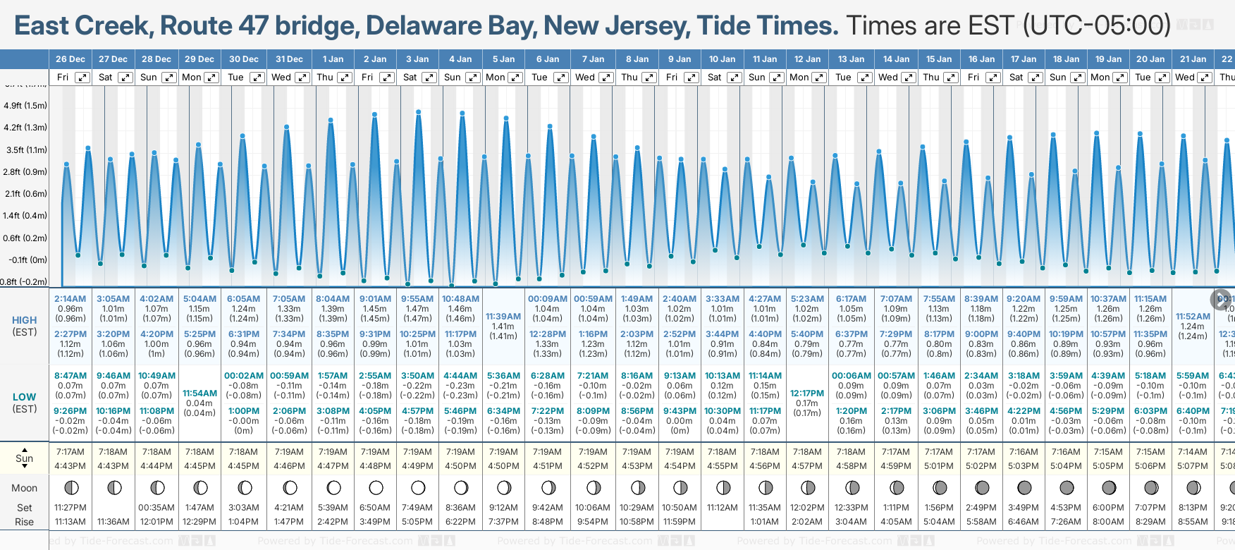 December and January Tide charts for East Creek, Route 47 bridge Bay: The tide charts below show the height, time and date of high and low tides for the next 30 days.