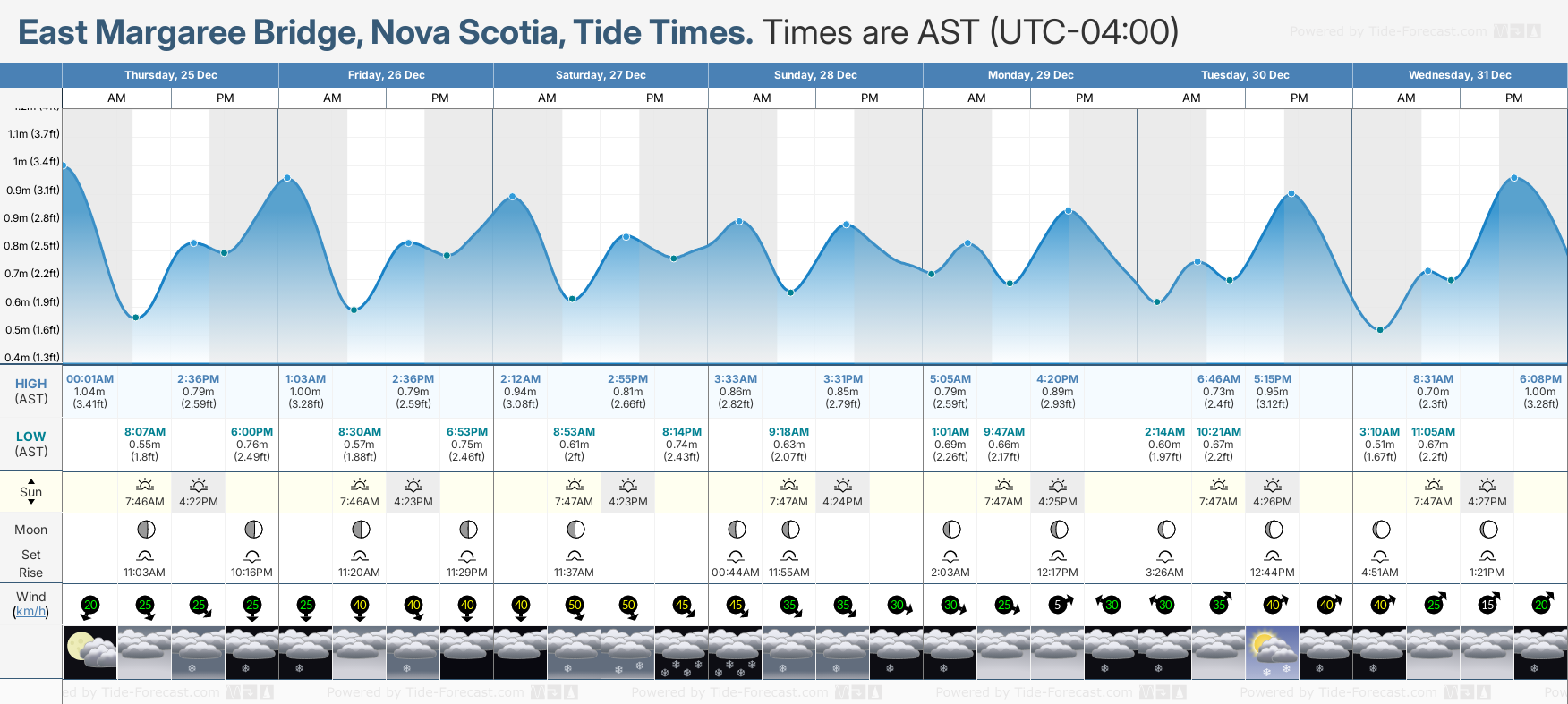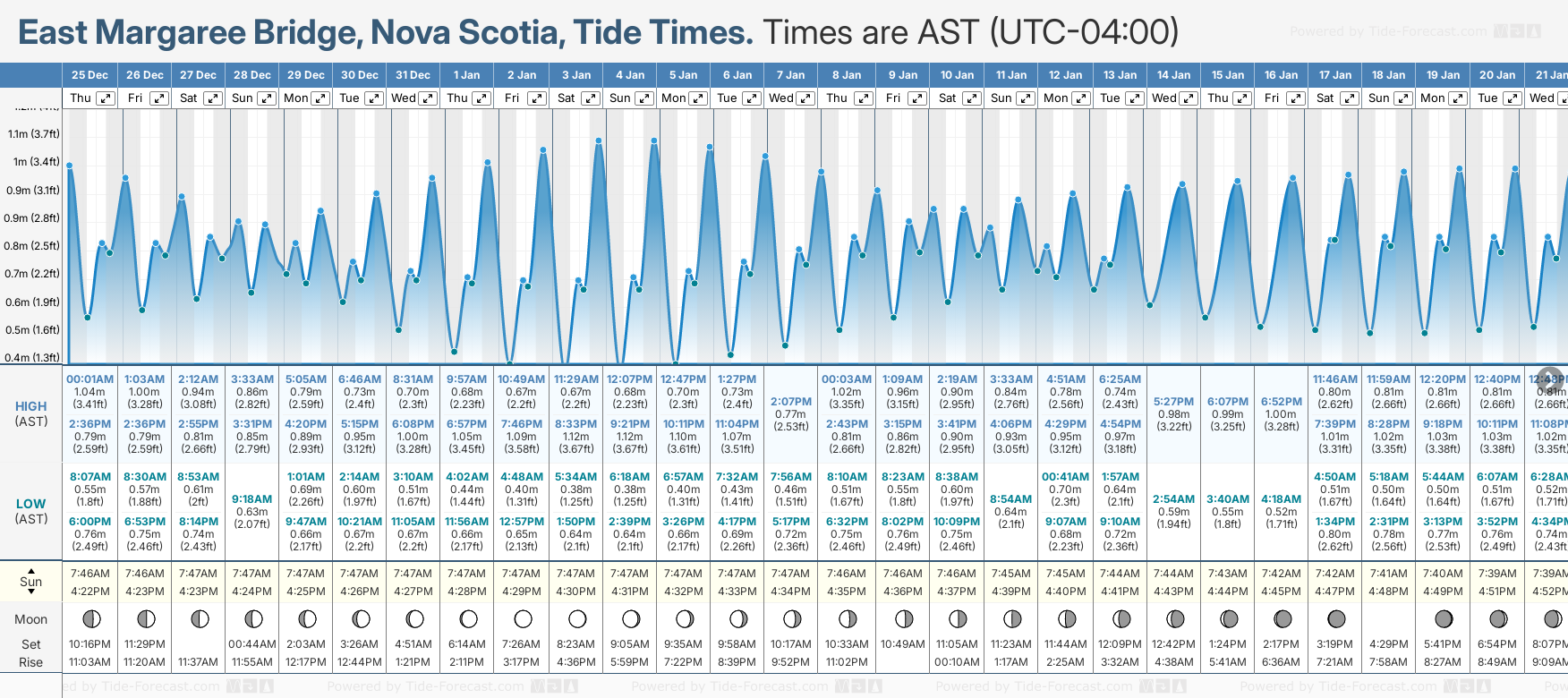 Tide Times are AST (UTC -4.0hrs). Last Spring High Tide at East Margaree Bridge was on Mon 22 Dec (height: 1.06m 3.5ft). Next high Spring Tide at East Margaree Bridge will be on Sat 03 Jan (height: 1.12m 3.7ft).