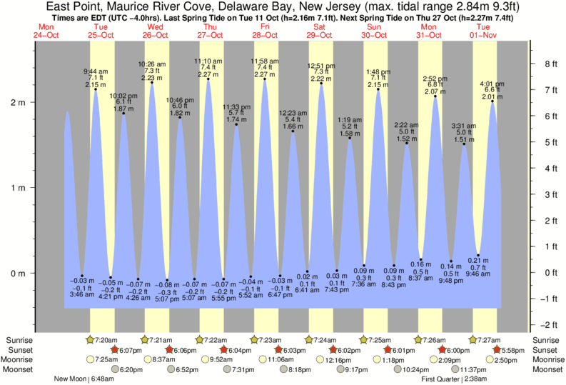 Tide chart for East Point, Maurice River Cove BayShowing low and high tide times for the next 30 days at East Point, Maurice River Cove Bay. Tide Times are EST (UTC -5.0hrs).