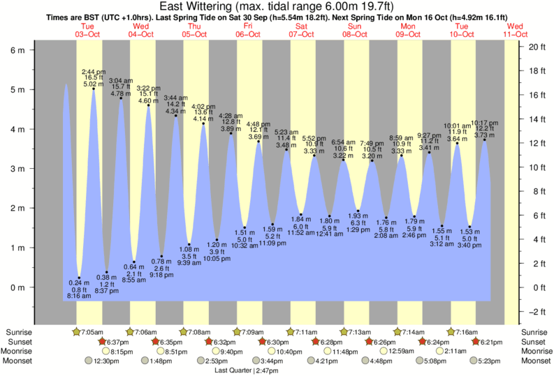 Tide Times are GMT (UTC +0hrs). Last Spring High Tide at East Wittering was on Sun 07 Dec (height: 5.20m 17.1ft). Next high Spring Tide at East Wittering will be on Mon 22 Dec (height: 4.52m 14.8ft).