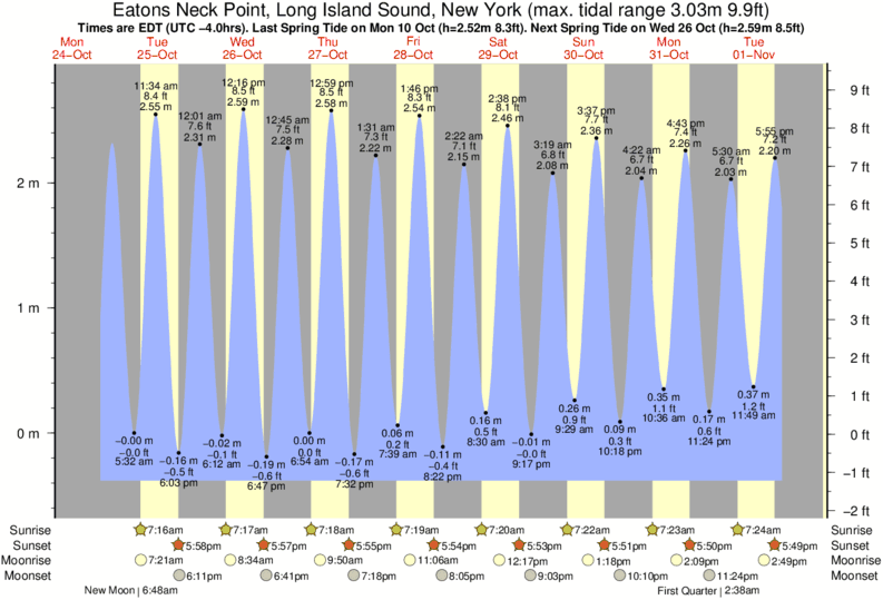Tide Times are EST (UTC -5.0hrs). Last Spring High Tide at Eatons Neck Point, Long Island Sound was on Fri 05 Dec (height: 2.64m 8.7ft). Next high Spring Tide at Eatons Neck Point, Long Island Sound will be on Sun 21 Dec (height: 2.30m 7.5ft).