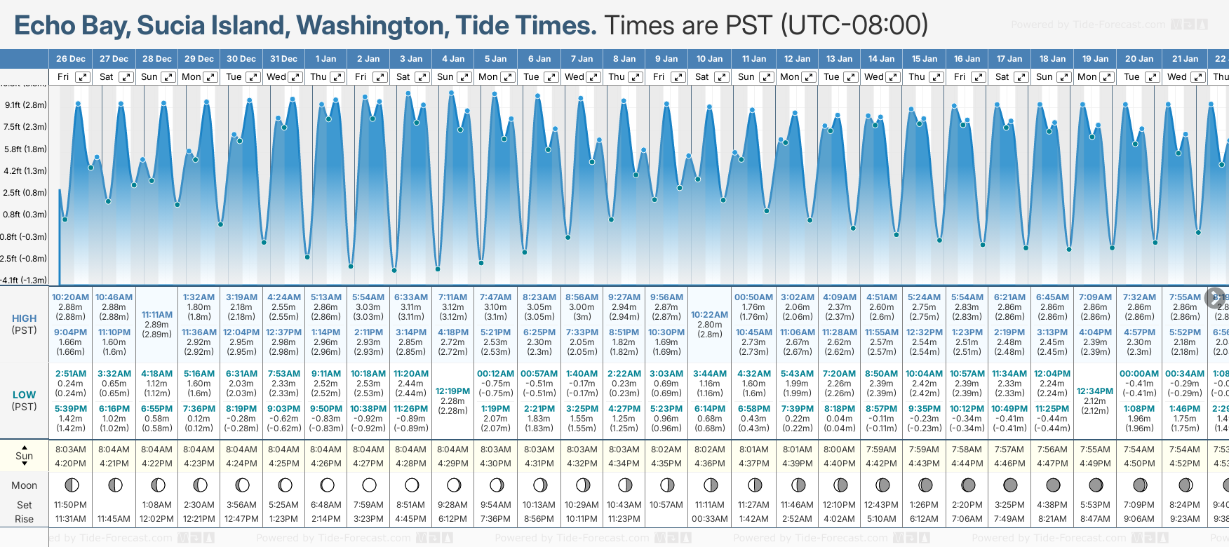 December and January Tide charts for Echo Bay, Sucia Island: The tide charts below show the height, time and date of high and low tides for the next 30 days.