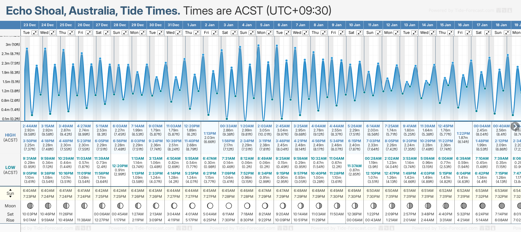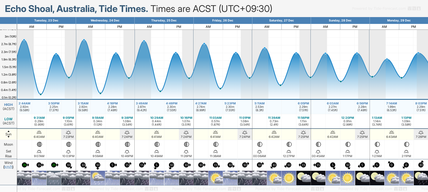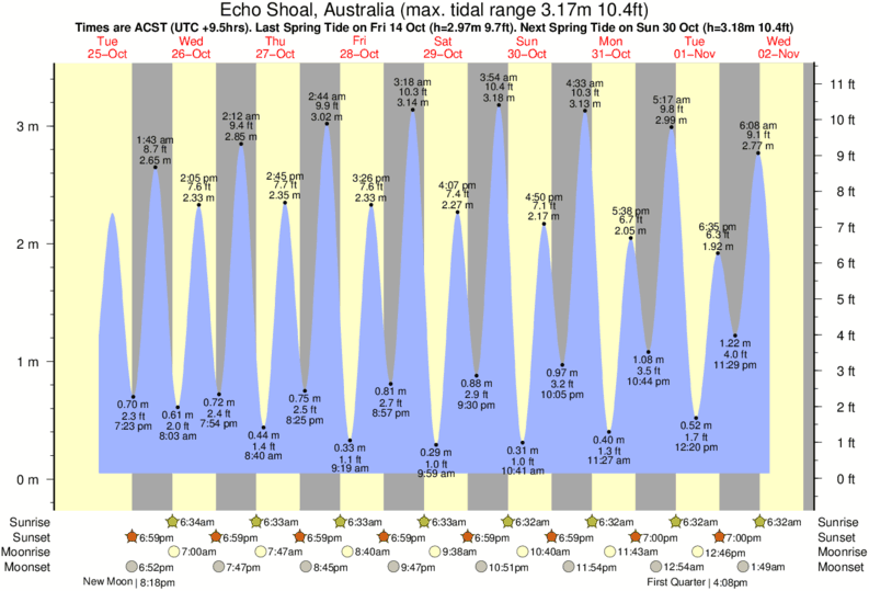 Tide Times are ACST (UTC +9.5hrs). Last Spring High Tide at Echo Shoal was on Mon 08 Dec (height: 3.20m 10.5ft). Next high Spring Tide at Echo Shoal will be on Tue 23 Dec (height: 2.92m 9.6ft).