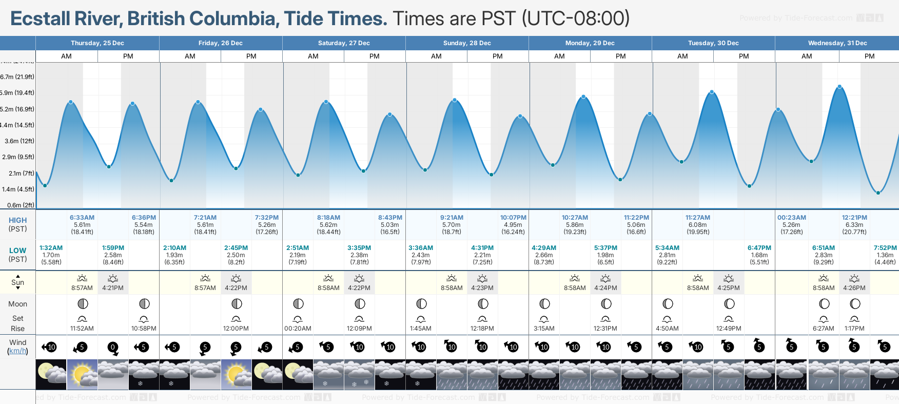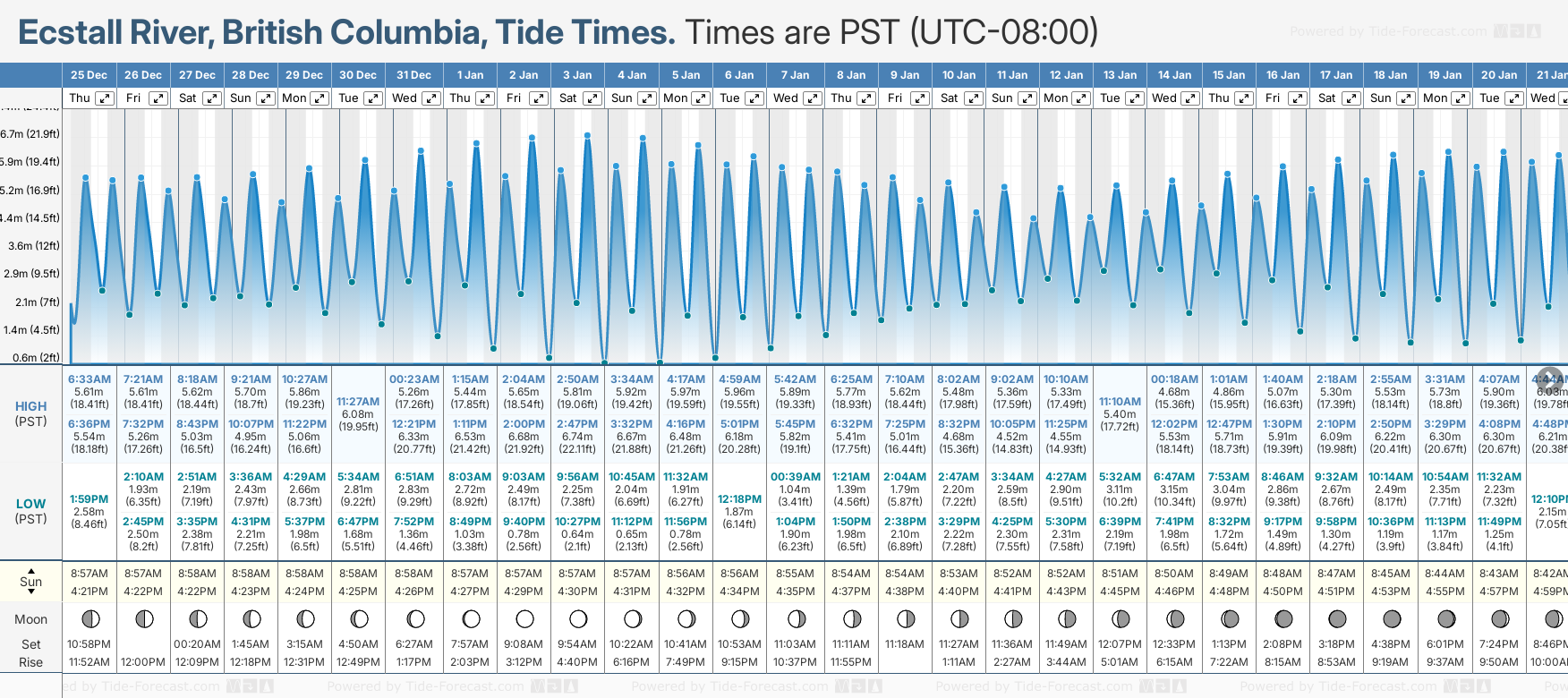 Tide Times are PST (UTC -8.0hrs). Last Spring High Tide at Ecstall River was on Sat 20 Dec (height: 6.24m 20.5ft). Next high Spring Tide at Ecstall River will be on Sat 03 Jan (height: 6.74m 22.1ft).