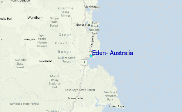 Use this relief map to navigate to tide stations, surf breaks and cities that are in the area of Eden, Australia.