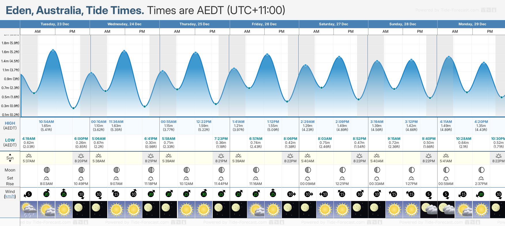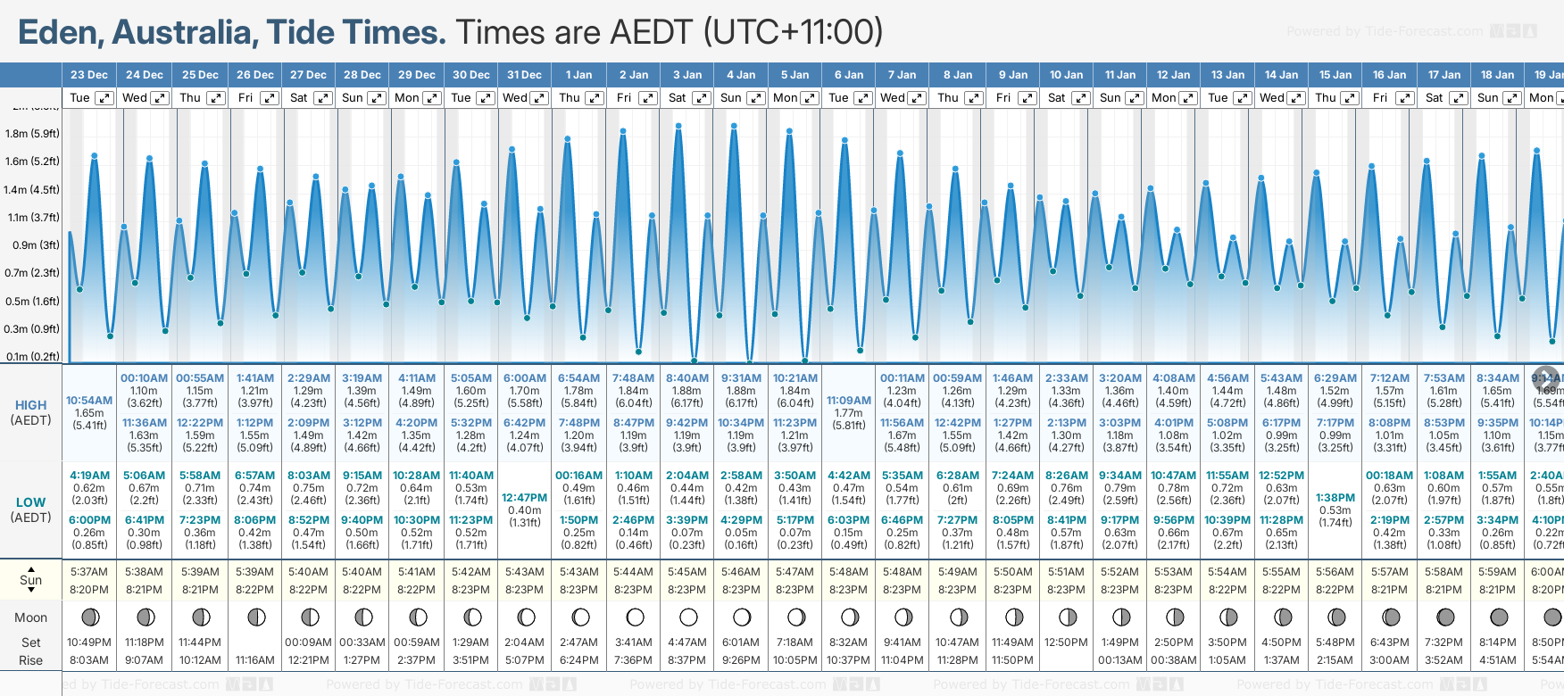 Tide chart for EdenShowing low and high tide times for the next 30 days at Eden. Tide Times are AEDT (UTC +11.0hrs).