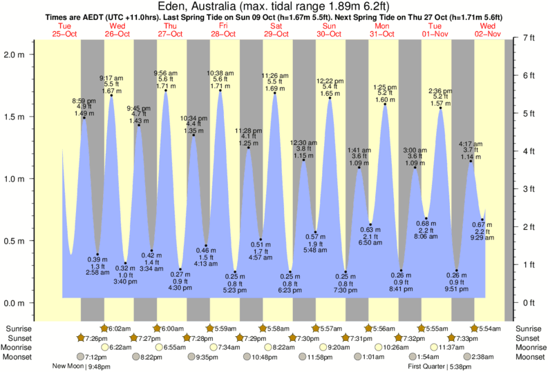 Tide Times are AEDT (UTC +11.0hrs). Last Spring High Tide at Eden was on Sat 20 Dec (height: 1.67m 5.5ft). Next high Spring Tide at Eden will be on Sat 03 Jan (height: 1.88m 6.2ft).