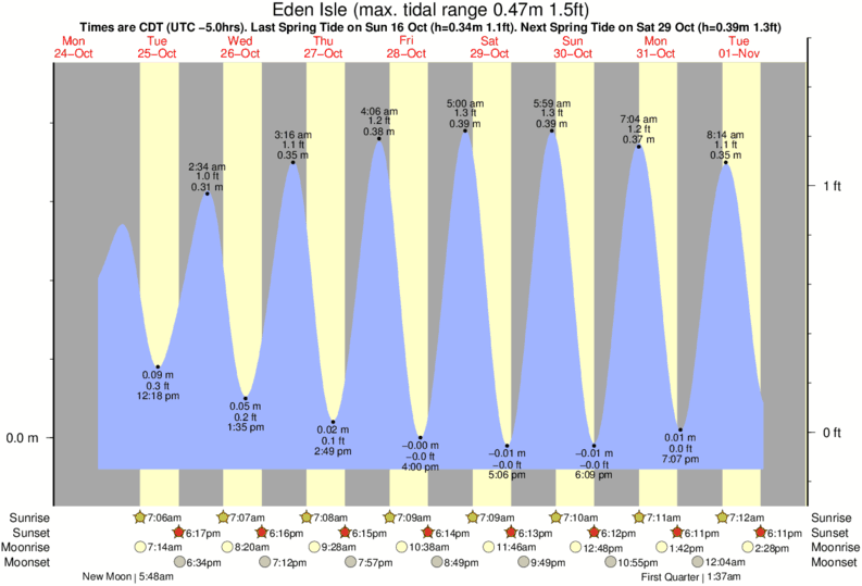 Tide Times are CST (UTC -6.0hrs). Last Spring High Tide at Eden Isle was on Fri 05 Dec (height: 0.44m 1.4ft). Next high Spring Tide at Eden Isle will be on Thu 01 Jan (height: 0.43m 1.4ft).