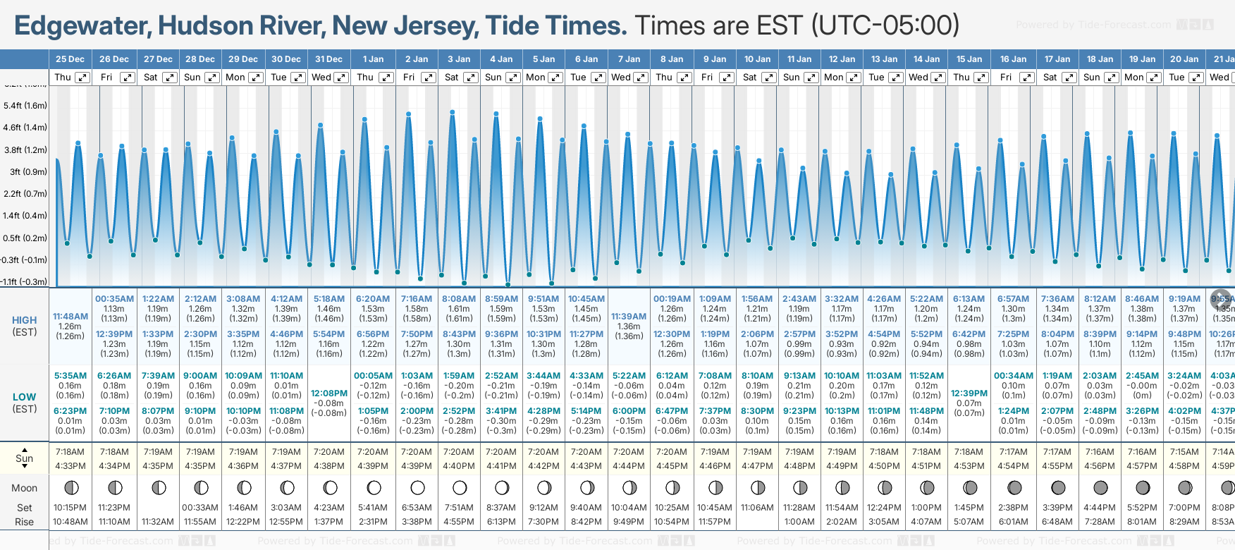 December and January Tide charts for Edgewater, Hudson River: The tide charts below show the height, time and date of high and low tides for the next 30 days.
