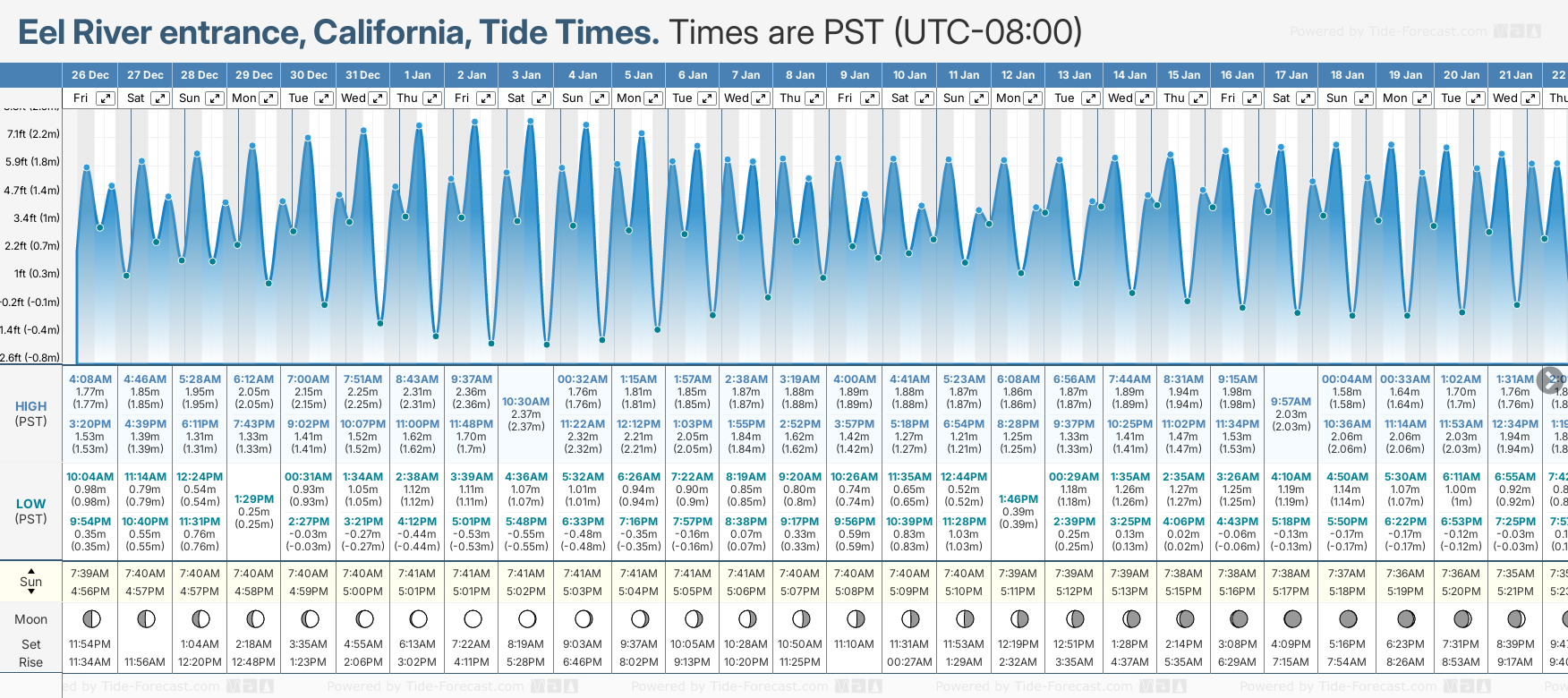 Tide Times are PST (UTC -8.0hrs). Last Spring High Tide at Eel River entrance was on Sat 20 Dec (height: 2.02m 6.6ft). Next high Spring Tide at Eel River entrance will be on Sat 03 Jan (height: 2.37m 7.8ft).