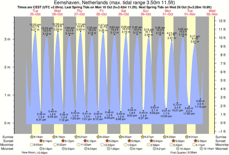 Tide Times are CET (UTC +1.0hrs). Last Spring High Tide at Eemshaven was on Tue 09 Dec (height: 3.29m 10.8ft). Next high Spring Tide at Eemshaven will be on Tue 23 Dec (height: 3.21m 10.5ft).