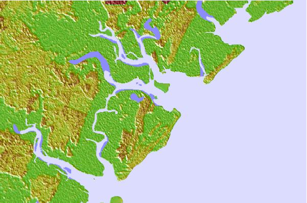 Use this relief map to navigate to tide stations, surf breaks and cities that are in the area of Egg Islands, Ossabaw Sound, Georgia.
