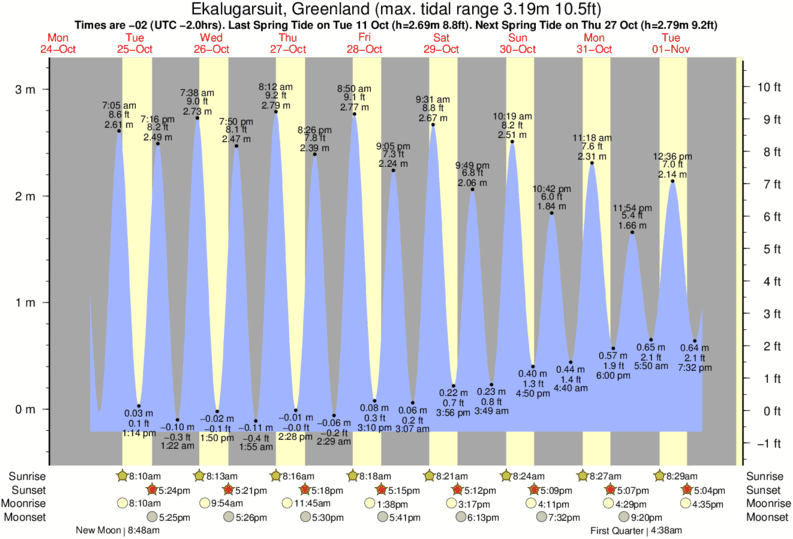Tide Times are -03 (UTC -3.0hrs). Last Spring High Tide at Ekalugarsuit was on Sat 06 Dec (height: 2.95m 9.7ft). Next high Spring Tide at Ekalugarsuit will be on Mon 22 Dec (height: 2.55m 8.4ft).