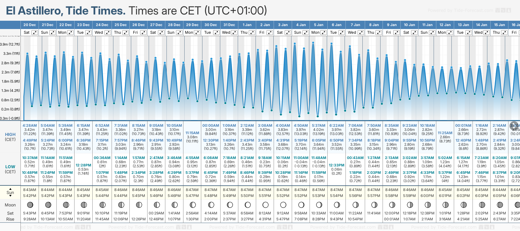 Tide Times are CET (UTC +1.0hrs). Last Spring High Tide at El Astillero was on Sat 06 Dec (height: 3.99m 13.1ft). Next high Spring Tide at El Astillero will be on Mon 22 Dec (height: 3.49m 11.5ft).