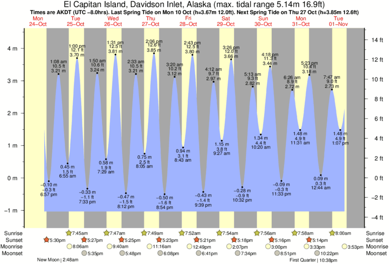 Tide Times are AKST (UTC -9.0hrs). Last Spring High Tide at El Capitan Island, Davidson Inlet was on Fri 05 Dec (height: 4.17m 13.7ft). Next high Spring Tide at El Capitan Island, Davidson Inlet will be on Sat 20 Dec (height: 3.56m 11.7ft).