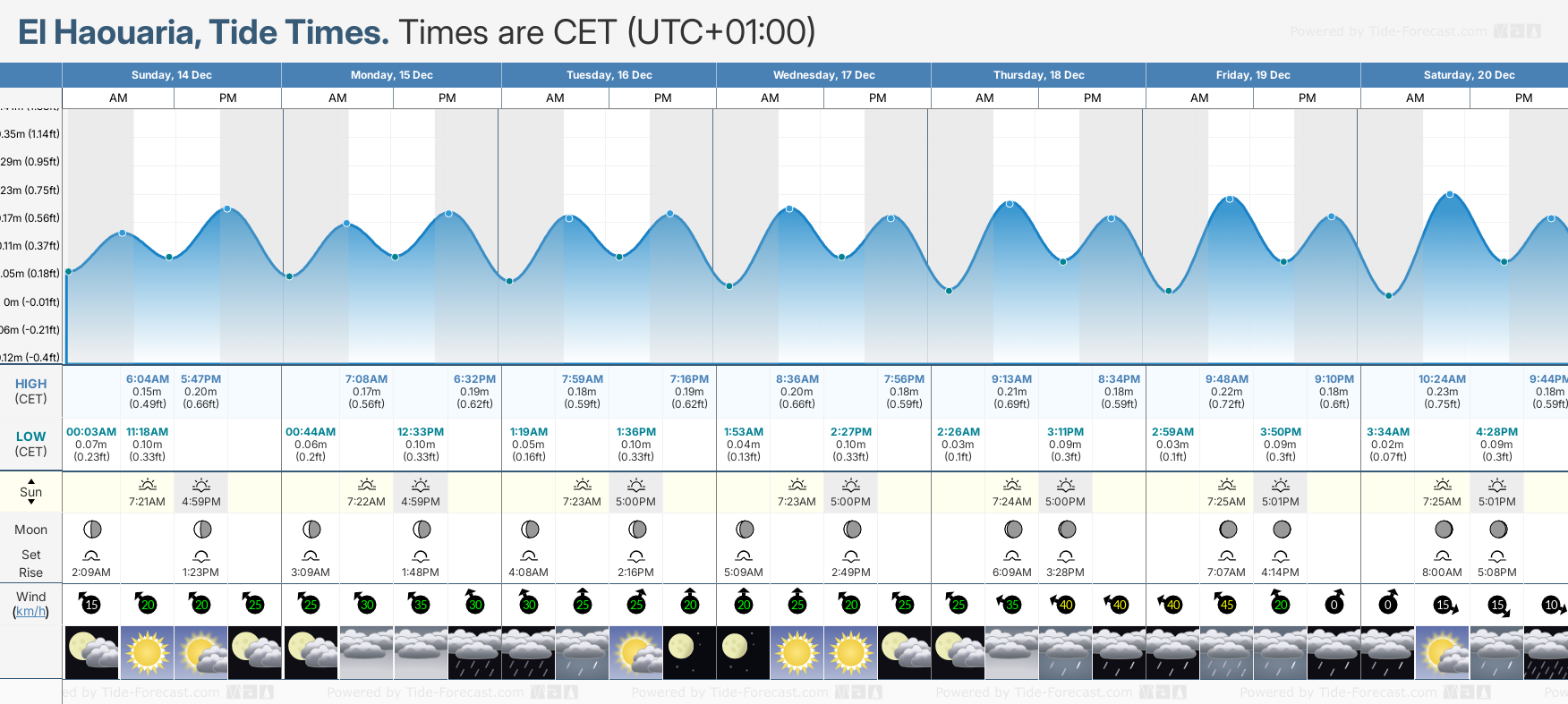 El Haouaria Tide Chart including high and low tide times for the next 7 days