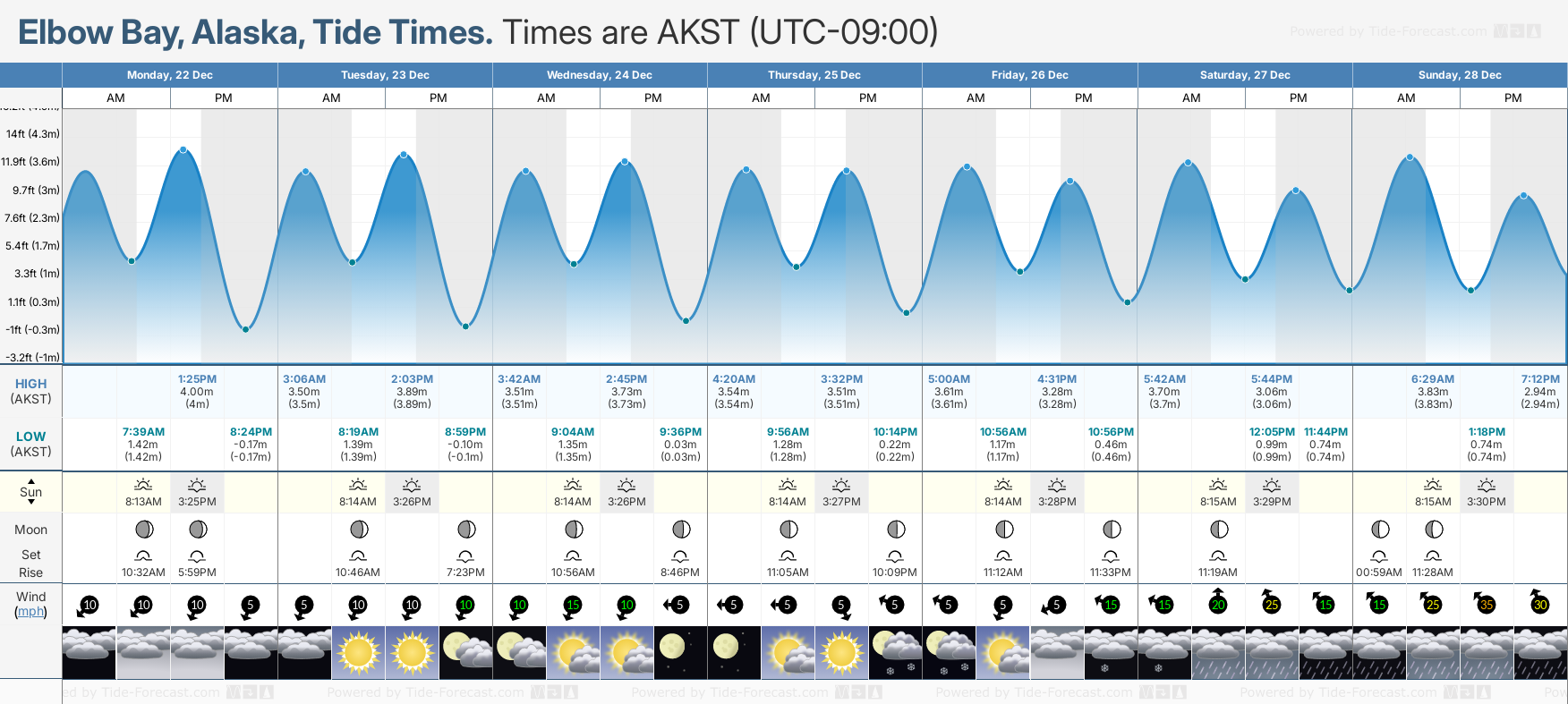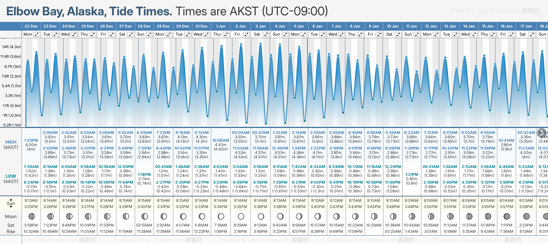 Tide Times are AKST (UTC -9.0hrs). Last Spring High Tide at Elbow Bay was on Sat 20 Dec (height: 4.08m 13.4ft). Next high Spring Tide at Elbow Bay will be on Sat 03 Jan (height: 4.57m 15.0ft).
