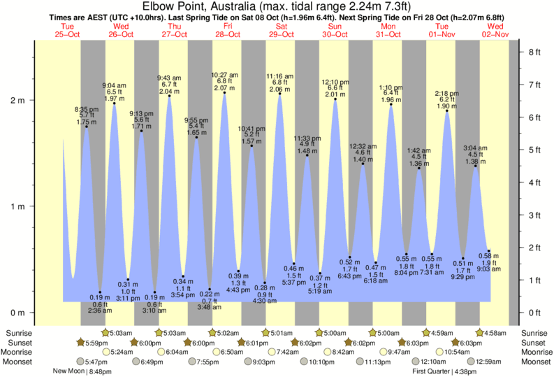 Tide Times are AEST (UTC +10.0hrs). Last Spring High Tide at Elbow Point was on Sat 06 Dec (height: 2.28m 7.5ft). Next high Spring Tide at Elbow Point will be on Mon 22 Dec (height: 2.06m 6.8ft).