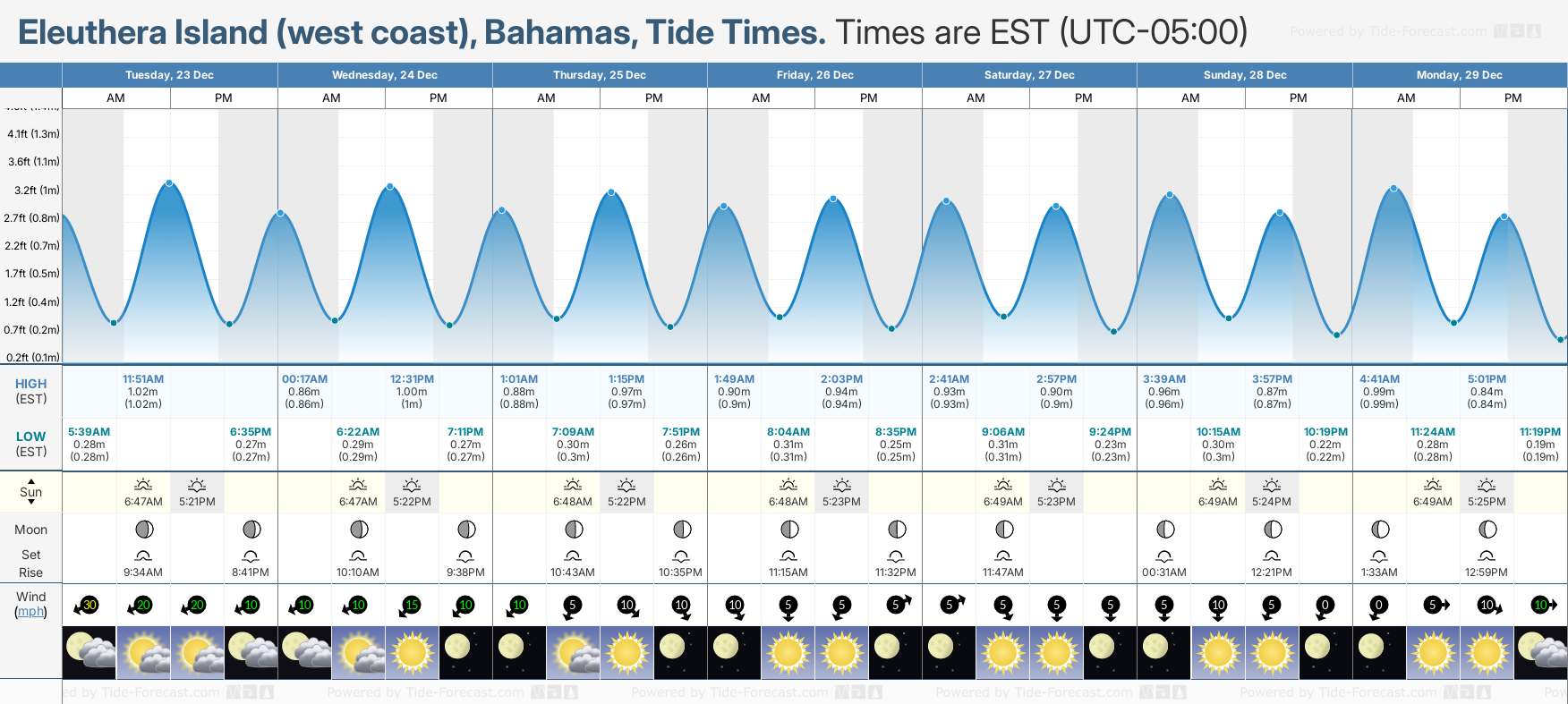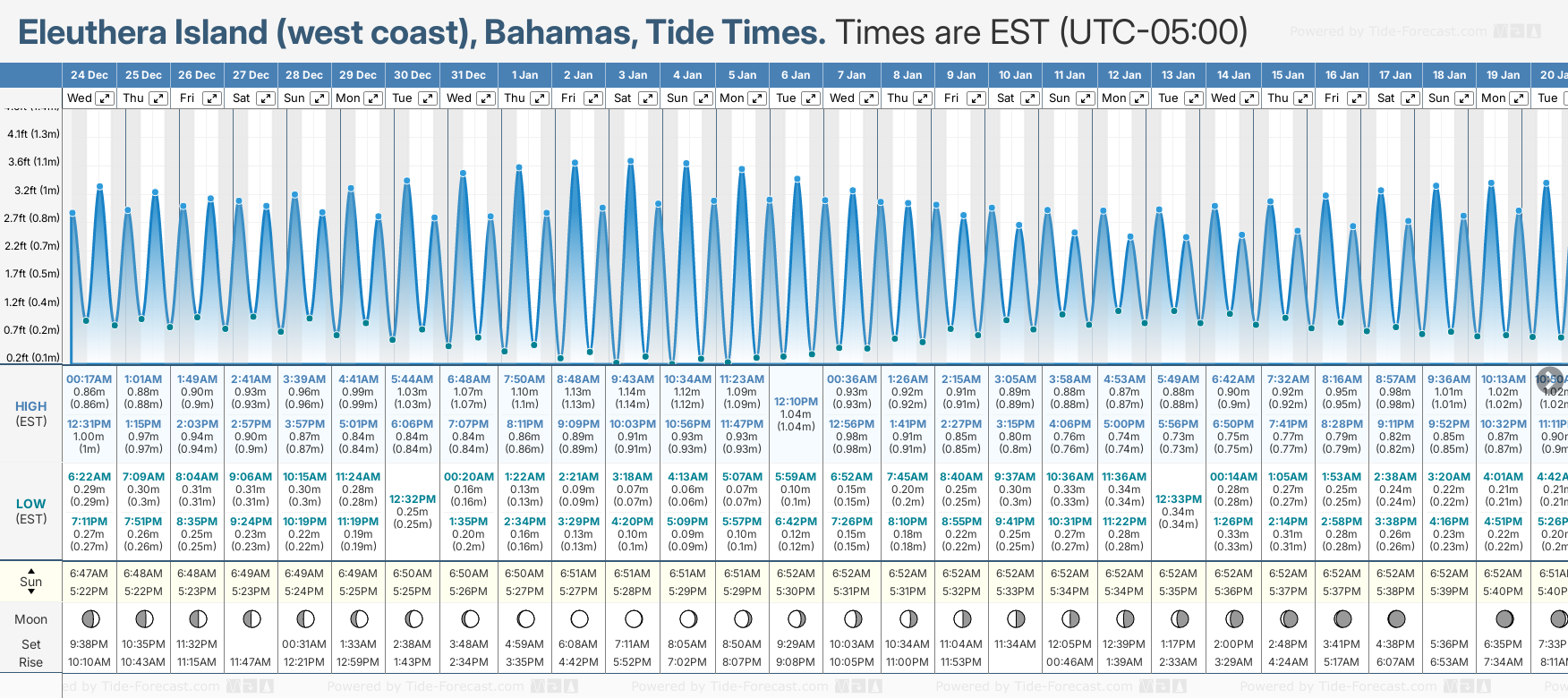 December and January Tide charts for Eleuthera Island (west coast): The tide charts below show the height, time and date of high and low tides for the next 30 days.
