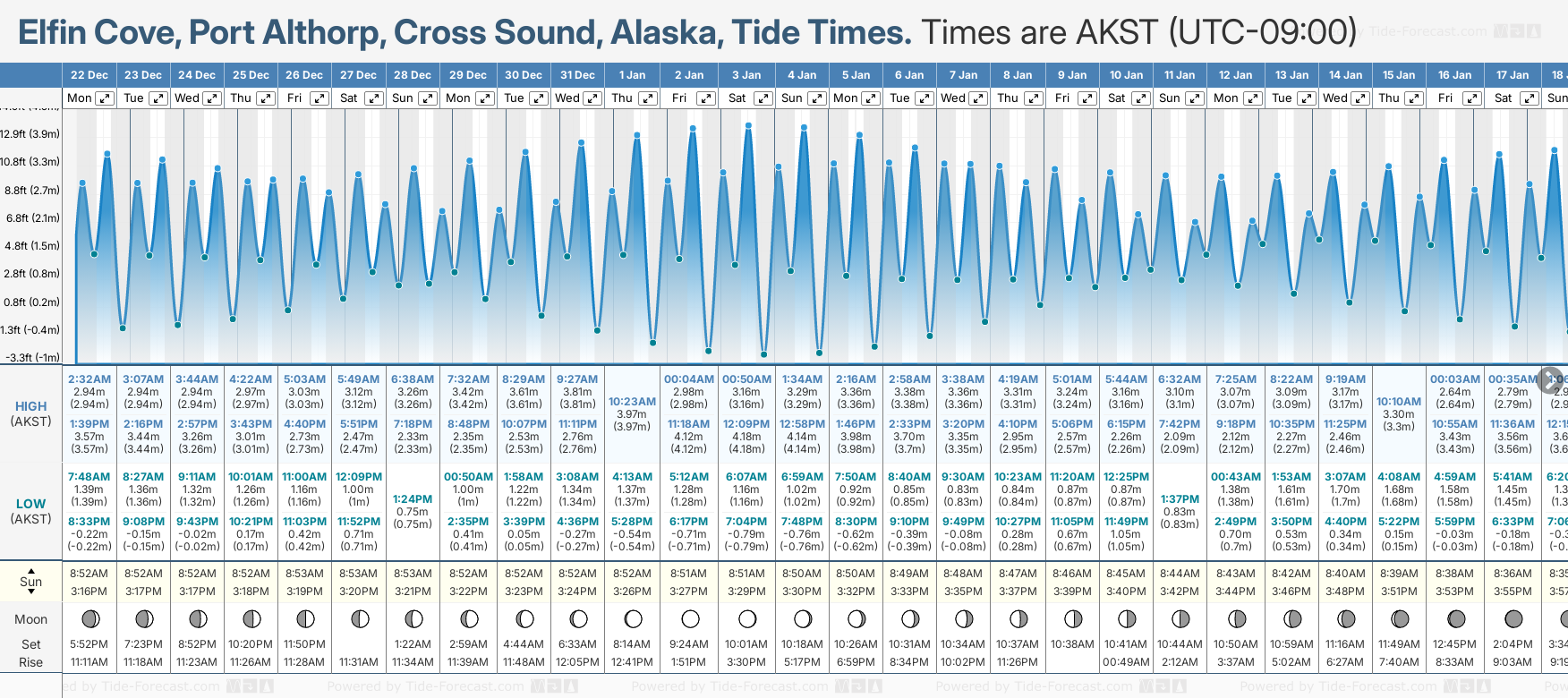 December and January Tide charts for Elfin Cove, Port Althorp, Cross Sound: The tide charts below show the height, time and date of high and low tides for the next 30 days.