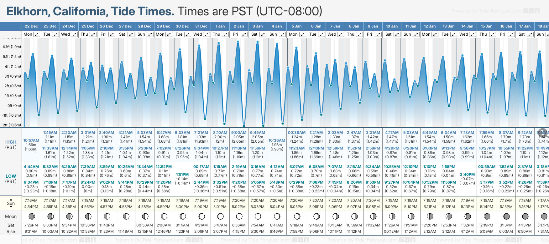 Tide Times are PST (UTC -8.0hrs). Last Spring High Tide at Elkhorn was on Sat 20 Dec (height: 1.70m 5.6ft). Next high Spring Tide at Elkhorn will be on Fri 02 Jan (height: 2.05m 6.7ft).