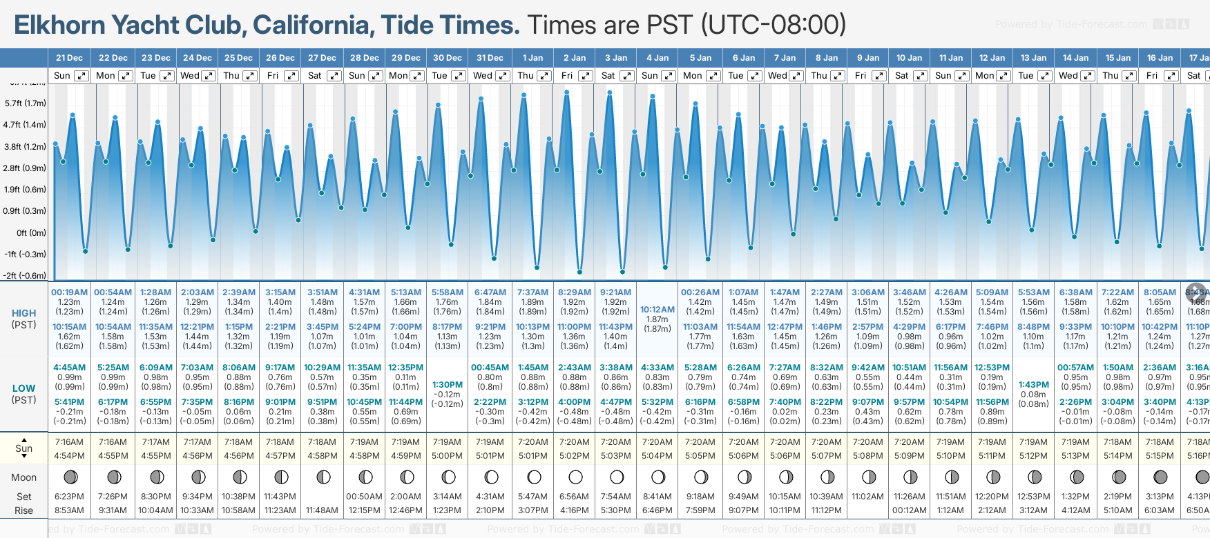 December and January Tide charts for Elkhorn Yacht Club: The tide charts below show the height, time and date of high and low tides for the next 30 days.
