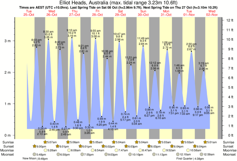 Tide Times are AEST (UTC +10.0hrs). Last Spring High Tide at Elliot Heads was on Fri 05 Dec (height: 3.30m 10.8ft). Next high Spring Tide at Elliot Heads will be on Mon 22 Dec (height: 3.08m 10.1ft).