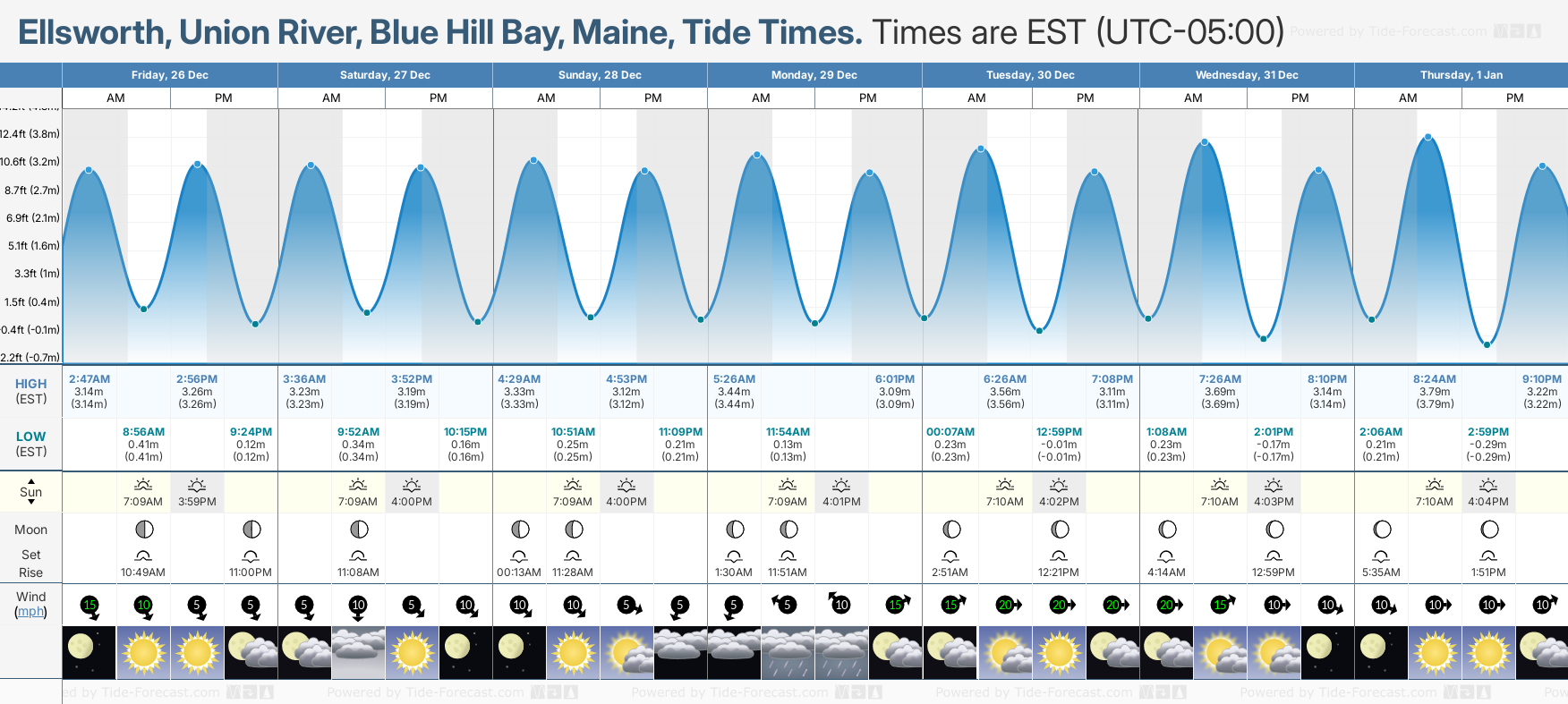 Tide Times for Ellsworth, Union River, Blue Hill Bay (tomorrow): Saturday 27 December 2025