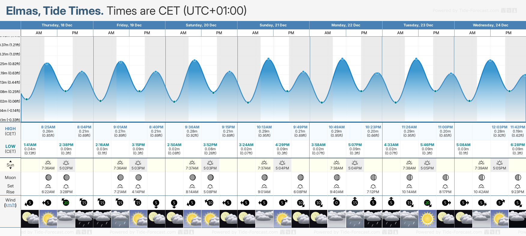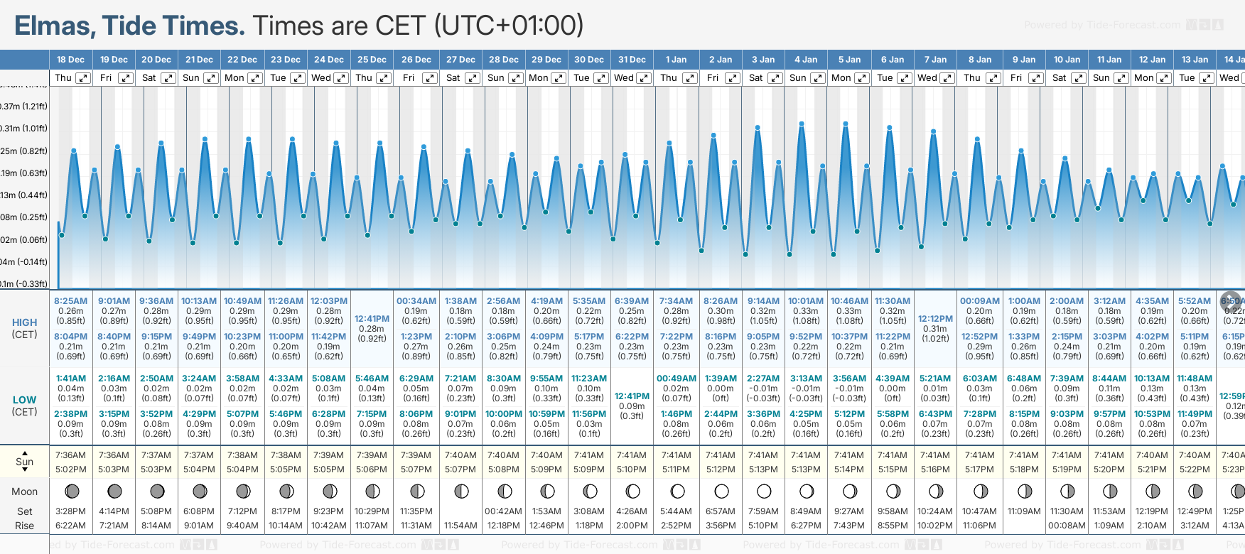 Tide Times are CET (UTC +1.0hrs). Last Spring High Tide at Elmas was on Sat 06 Dec (height: 0.33m 1.1ft). Next high Spring Tide at Elmas will be on Sun 21 Dec (height: 0.29m 1.0ft).