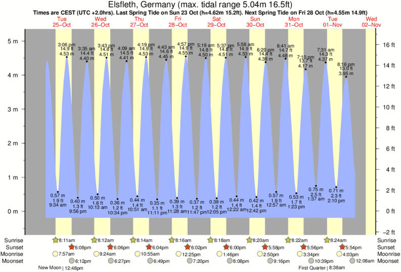 Tide Times are CET (UTC +1.0hrs). Last Spring High Tide at Elsfleth was on Mon 08 Dec (height: 4.52m 14.8ft). Next high Spring Tide at Elsfleth will be on Mon 22 Dec (height: 4.66m 15.3ft).