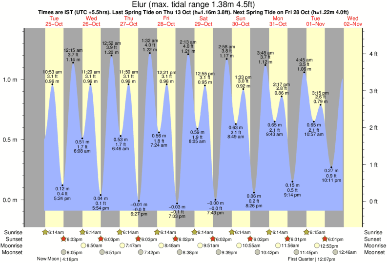 Tide Times are IST (UTC +5.5hrs). Last Spring High Tide at Elur was on Sat 06 Dec (height: 1.28m 4.2ft). Next high Spring Tide at Elur will be on Tue 23 Dec (height: 1.17m 3.8ft).