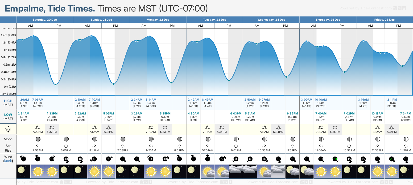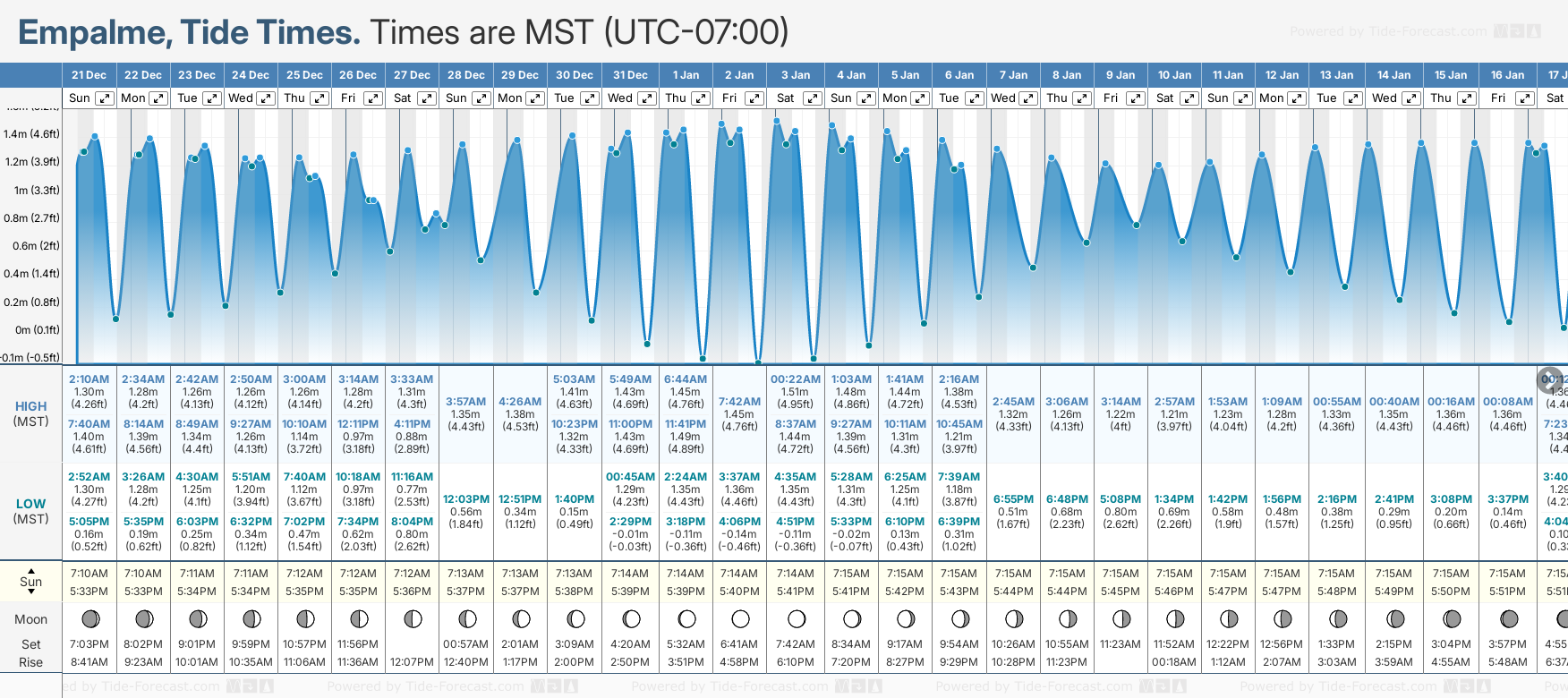 Tide chart for EmpalmeShowing low and high tide times for the next 30 days at Empalme. Tide Times are MST (UTC -7.0hrs).
