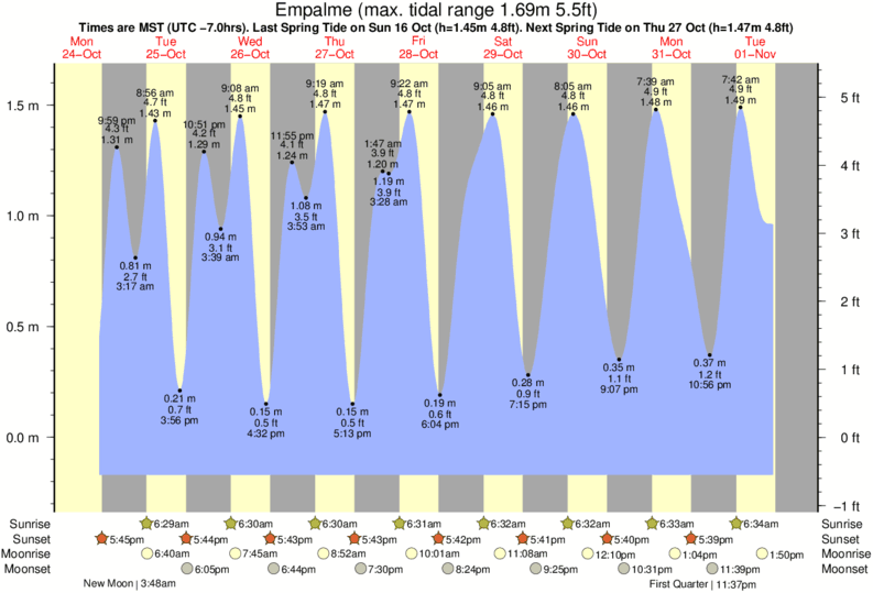 Tide Times are MST (UTC -7.0hrs). Last Spring High Tide at Empalme was on Thu 04 Dec (height: 1.50m 4.9ft). Next high Spring Tide at Empalme will be on Sat 20 Dec (height: 1.40m 4.6ft).