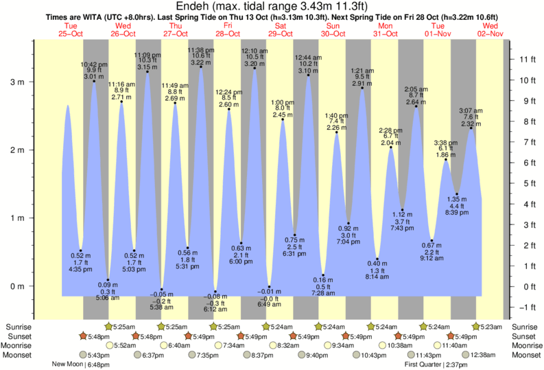 December and January Tide charts for Endeh: The tide charts below show the height, time and date of high and low tides for the next 30 days.