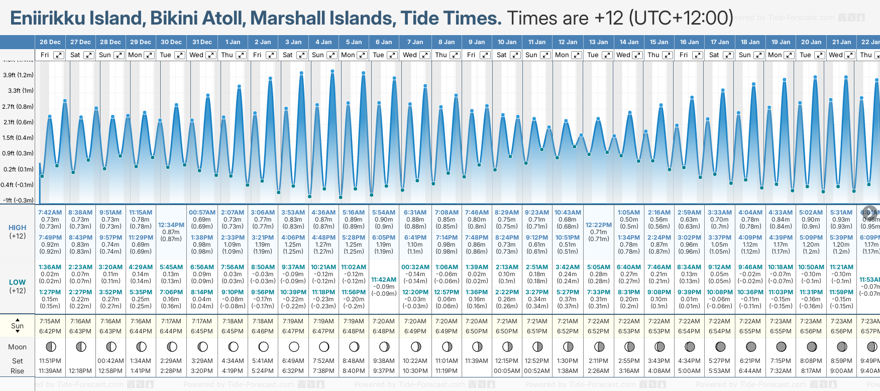 December and January Tide charts for Eniirikku Island, Bikini Atoll: The tide charts below show the height, time and date of high and low tides for the next 30 days.
