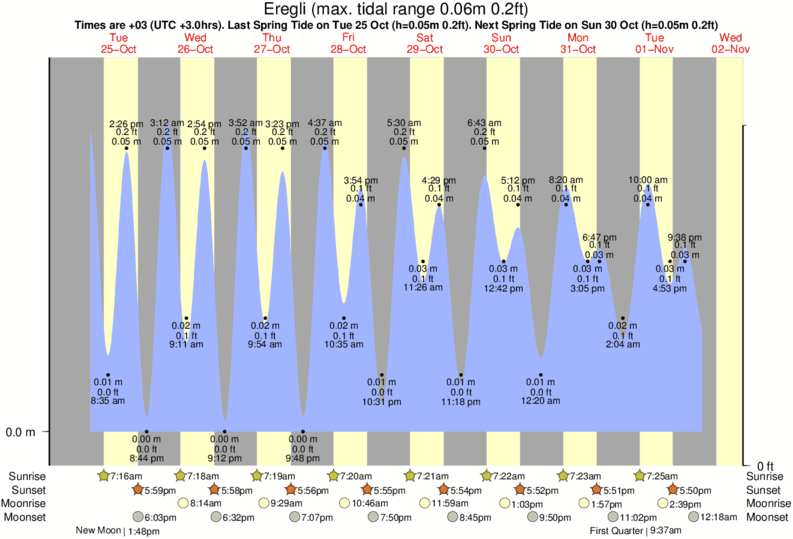 Tide Times are +03 (UTC +3.0hrs). Last Spring High Tide at Eregli was on Fri 19 Dec (height: 0.05m 0.2ft). Next high Spring Tide at Eregli will be on Wed 24 Dec (height: 0.05m 0.2ft).