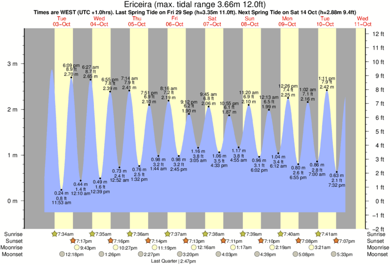 Tide chart for EriceiraShowing low and high tide times for the next 30 days at Ericeira. Tide Times are WET (UTC +0hrs).