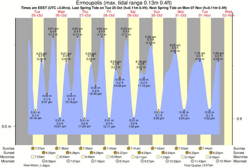 Tide Times are EET (UTC +2.0hrs). Last Spring High Tide at Ermoupolis was on Sat 20 Dec (height: 0.11m 0.4ft). Next high Spring Tide at Ermoupolis will be on Fri 02 Jan (height: 0.12m 0.4ft).