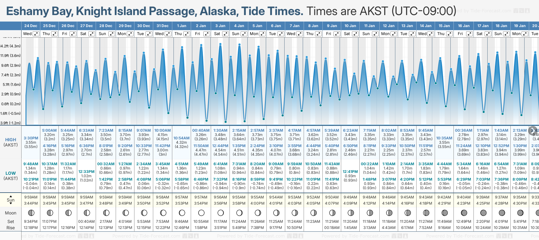 Tide Times are AKST (UTC -9.0hrs). Last Spring High Tide at Eshamy Bay, Knight Island Passage was on Sun 21 Dec (height: 3.96m 13.0ft). Next high Spring Tide at Eshamy Bay, Knight Island Passage will be on Sat 03 Jan (height: 4.54m 14.9ft).