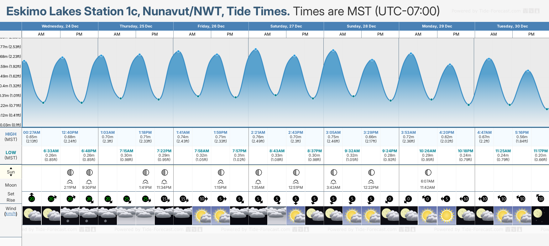 Tide Times are MST (UTC -7.0hrs). Last Spring High Tide at Eskimo Lakes Station 1c was on Wed 10 Dec (height: 0.76m 2.5ft). Next high Spring Tide at Eskimo Lakes Station 1c will be on Fri 26 Dec (height: 0.76m 2.5ft).