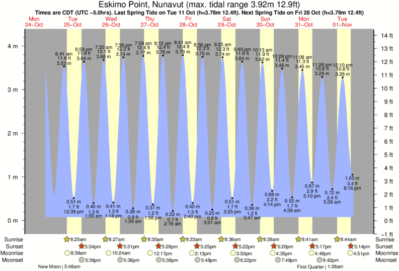 Eskimo Point tide chart key: The tide chart above shows the height and times of high tide and low tide for Eskimo Point, Nunavut. The grey shading corresponds to nighttime hours between sunset and sunrise at Eskimo Point.