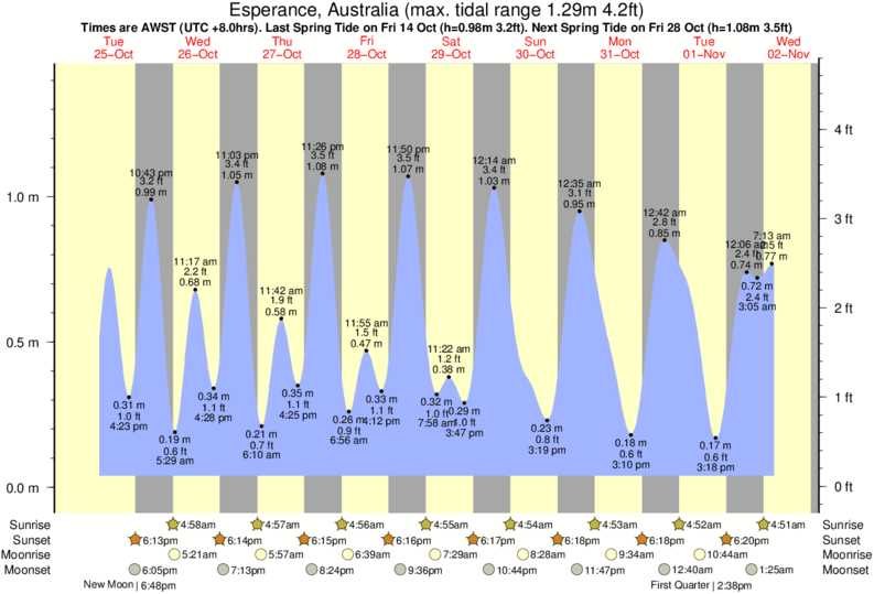 Tide Times are AWST (UTC +8.0hrs). Last Spring High Tide at Esperance was on Sat 06 Dec (height: 1.18m 3.9ft). Next high Spring Tide at Esperance will be on Sun 21 Dec (height: 1.09m 3.6ft).