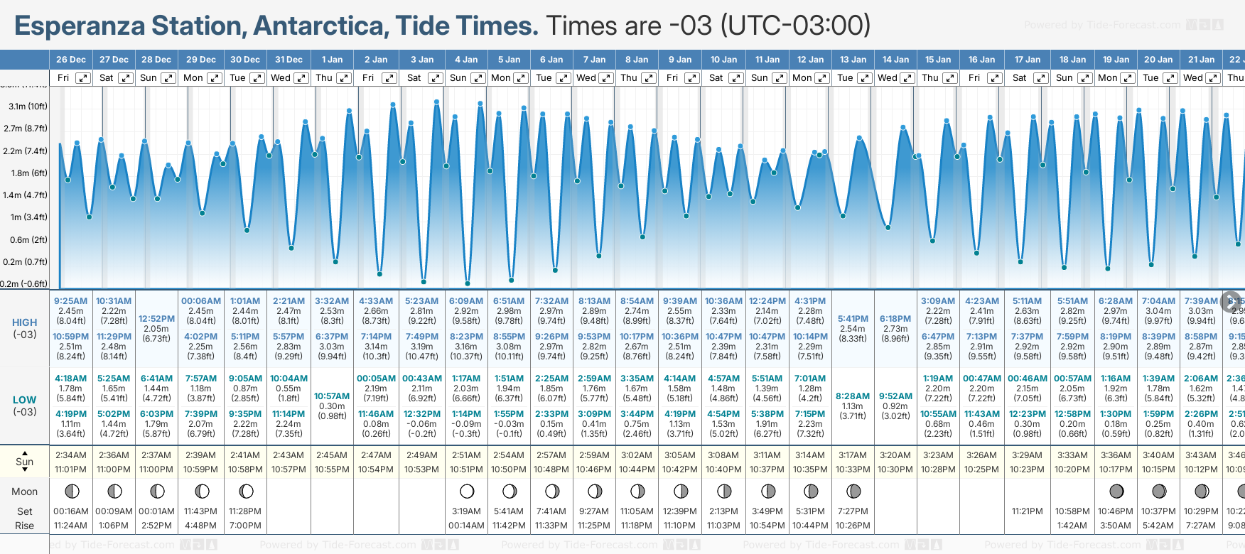 December and January Tide charts for Esperanza Station: The tide charts below show the height, time and date of high and low tides for the next 30 days.